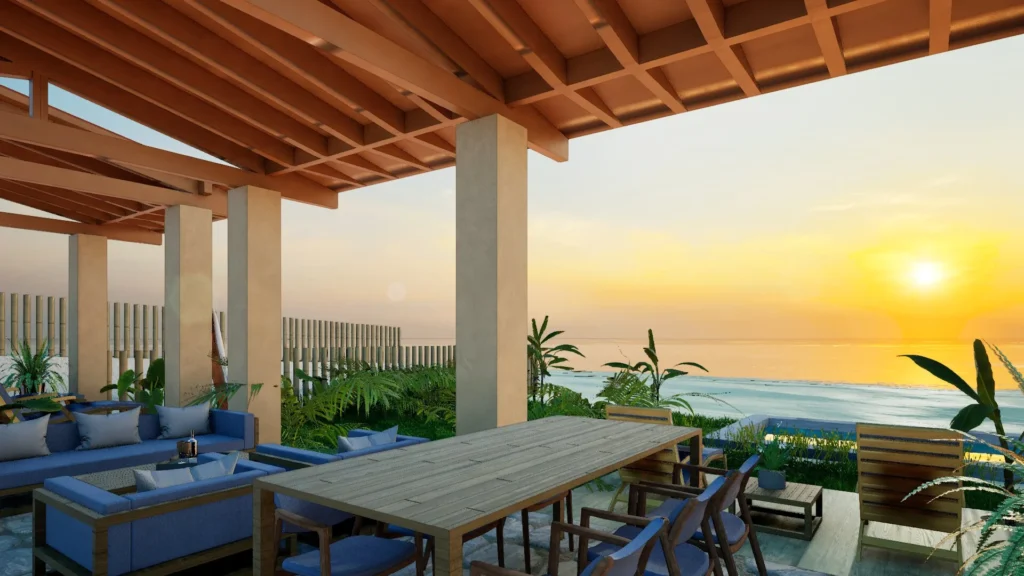 En este rincón bajo la pérgola, los asientos de madera clara y cojines blancos se agrupan alrededor de una mesa de centro baja.