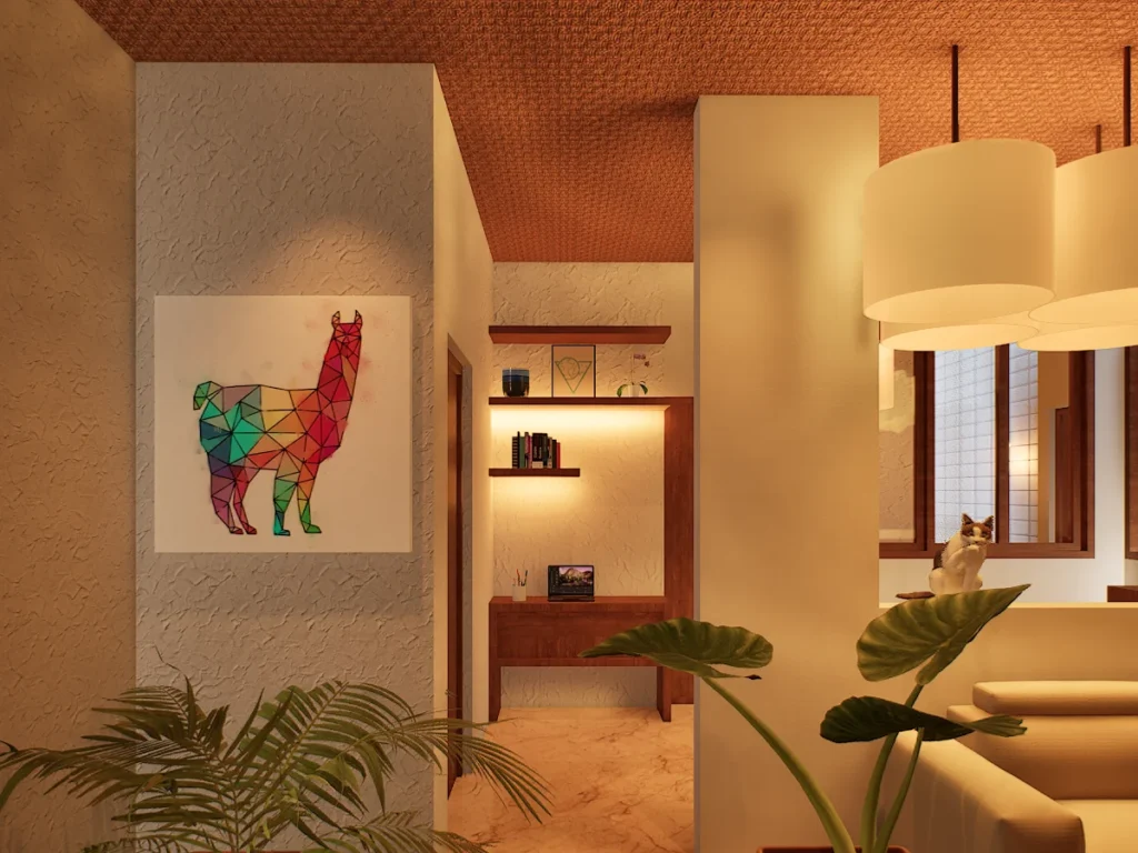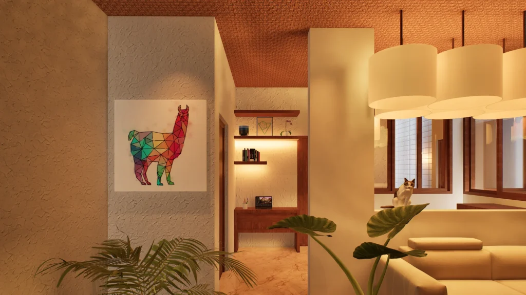 La sala, anclada en un eje continuo con ese patio, exhibe mobiliario de madera clara y cojines de lino blanco, irradiando la misma calma que la piedra costeña de sus muros. Tres lámparas de mimbre suspendidas filtran la luz del desierto en haces suaves, mientras en las paredes resplandecen una estrella de mar, un trazo abstracto de olas y siluetas de aves en vuelo, sutiles recordatorios de la cercanía al océano.