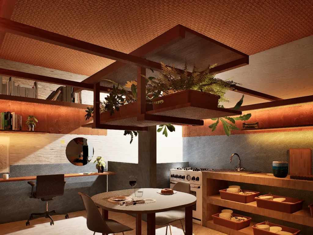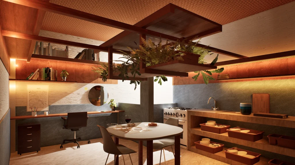 Este espacio fusiona la pureza del concreto pulido con la calidez de la madera clara, resultando en un rincón contemporáneo y acogedor. La barra central de hormigón, rematada en madera clara, articula visualmente el área y funciona como punto de encuentro. A ambos lados, estanterías empotradas exhiben objetos y plantas sin sobrecargar el ambiente; un muro de piedra irregular añade textura y evoca la geología costera.