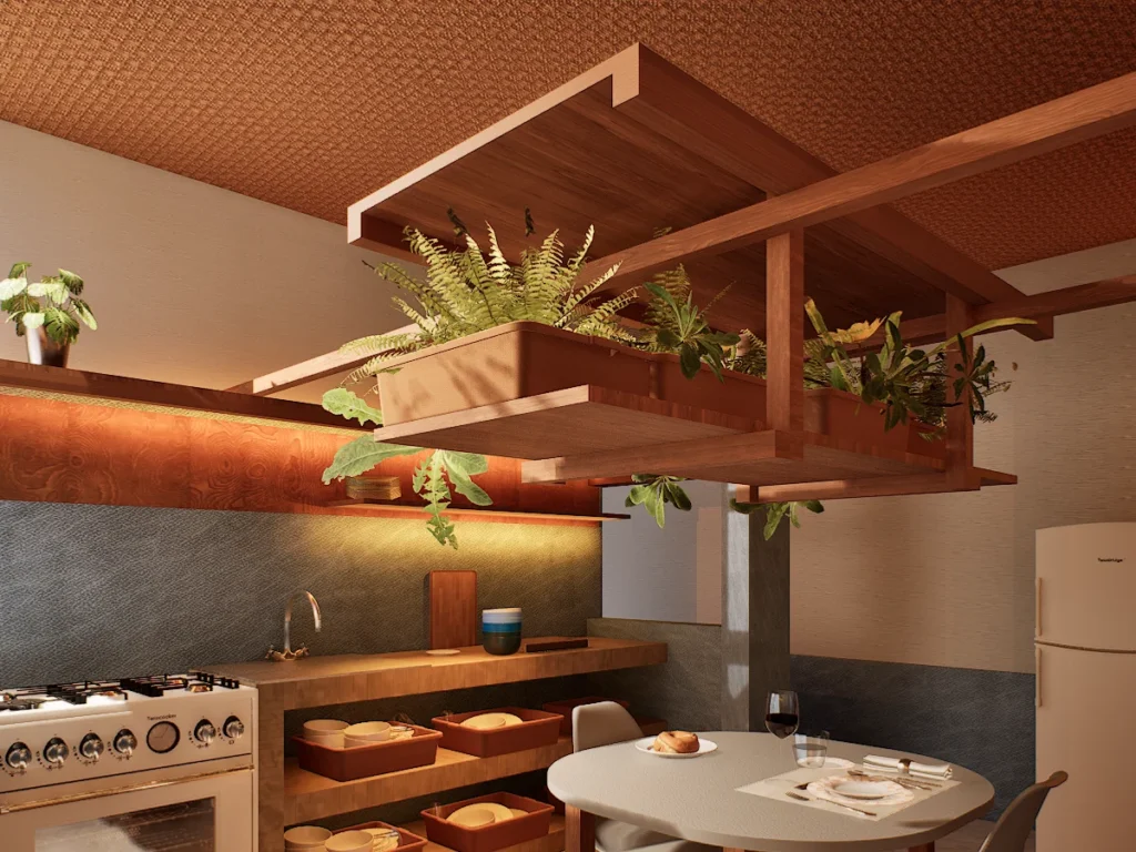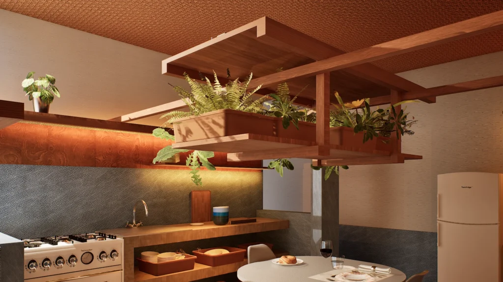 Este dormitorio aprovecha la brisa marina para crear un refugio fresco y sereno. Las literas, hechas de concreto pulido con detalles en madera clara, ofrecen un lecho doble abajo y un espacio íntimo arriba, unidos por una escalera de madera simple. Un muro en verde agua evoca la calma del Pacífico, mientras un tapiz de fibras naturales y una lámpara de mimbre aportan calidez artesanal.